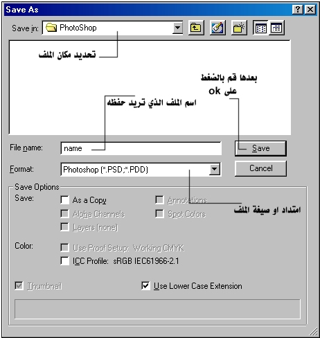 بعد الانتهاء من العمل عليك حفظ الصورة التي عملت بها,إذهب الىFile>Seve او ctrl+c ستظهر لك هذه النافذة: