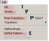 – الرقم 1 : هذا الأمر يعطيك خيار التعبئة ، سواء كانت التعبئة هذه بلون ما ، أو بخامة قمت أنت بإنشاؤها . – الرقم 2 : هذا الخيار يقوم بعمل حد للعنصر المحدد . – الرقم 3 : وهذا الأمر يخولك بالتحويل الحر لعنصرك ، فبعد اختيارك هذا الأمر تجد أنه قد تكونت لك مربعات بيضاء عند أطراف التصميم يمكنك من خلالها تغيير حجم أو مكان عنصرك . – الرقم 4 : وهو الأمر الخاص بتكوين الخامات . |