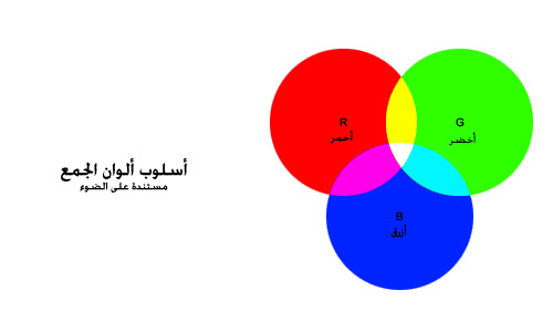أسلوب ألوان الجمع.. نظرية لونية .. مستندة على خصائص الضوء.. تقول النظرية: أن كل الألوان في الطيف المرئي مكوّنة من 3 ألوان أساسية : أحمر Red، أخضرGreen، أزرقBlue .. المعروفة اختصارا بـ RGB.. عند خلط هذه الألوان الأساسية مع بعضها في كميات مختلفة.. تحصل على بقية الألوان.. فيزيائيا.. اللون لايوجد مالم يكن هناك ضوء..! شرح مبسط: حينما يصطدم الضوء بجسم ما، يمتص هذا الجسم كل الألوان، ما عدا لونها الحقيقي.. مثال: التفاحة تمتص كل الألوان ما عدا الأحمر الذي ينعكس.. ! البرتقال يمتص كل الألوان ما عدا اللون البرتقالي الذي ينعكس..! وهكذا.. خلط لونين من ألوان الجمع الأساسية ينتج لون جمع ثانوي: قرمزي(فوشي) ، أصفر ، أزرق تركواز فاتح.. خلط ألوان الجمع كلها الأساسية يكون الأبيض الصافي..! تستعمل أجهزة التلفاز، وشاشات الكومبيوتر طريقة ألوان الجمع في عرض الألوان.. بإمكانك ملاحظة ألوان الجمع الأساسية عندما تقترب بعينيك جدا من شاشة التلفاز..! في الفوتوشوب.. أنت تصنع الألوان عن طريق اختيار قيم للأحمر والأخضر والأزرق RGB تكوّن اللون المطلوب.. لاحظ ذلك.. وستكوّن لوناً متقناً..!